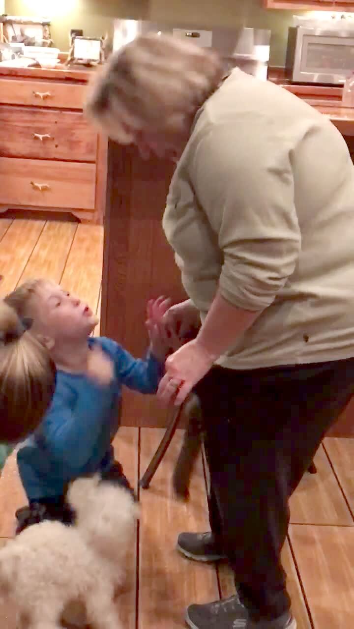 A pet baby squirrel climbs around a woman's body. She yells and cries out. Her family laughs.