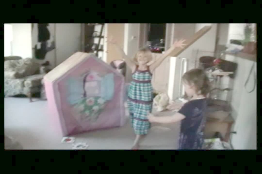 A young girl tells a man in a living room that she needs to test his strength, then she gives him two gallons of juice on a rope, books, and a plate of whipped cream. Then she cuts the rope, and the plate of whipped cream hits the man in the face.