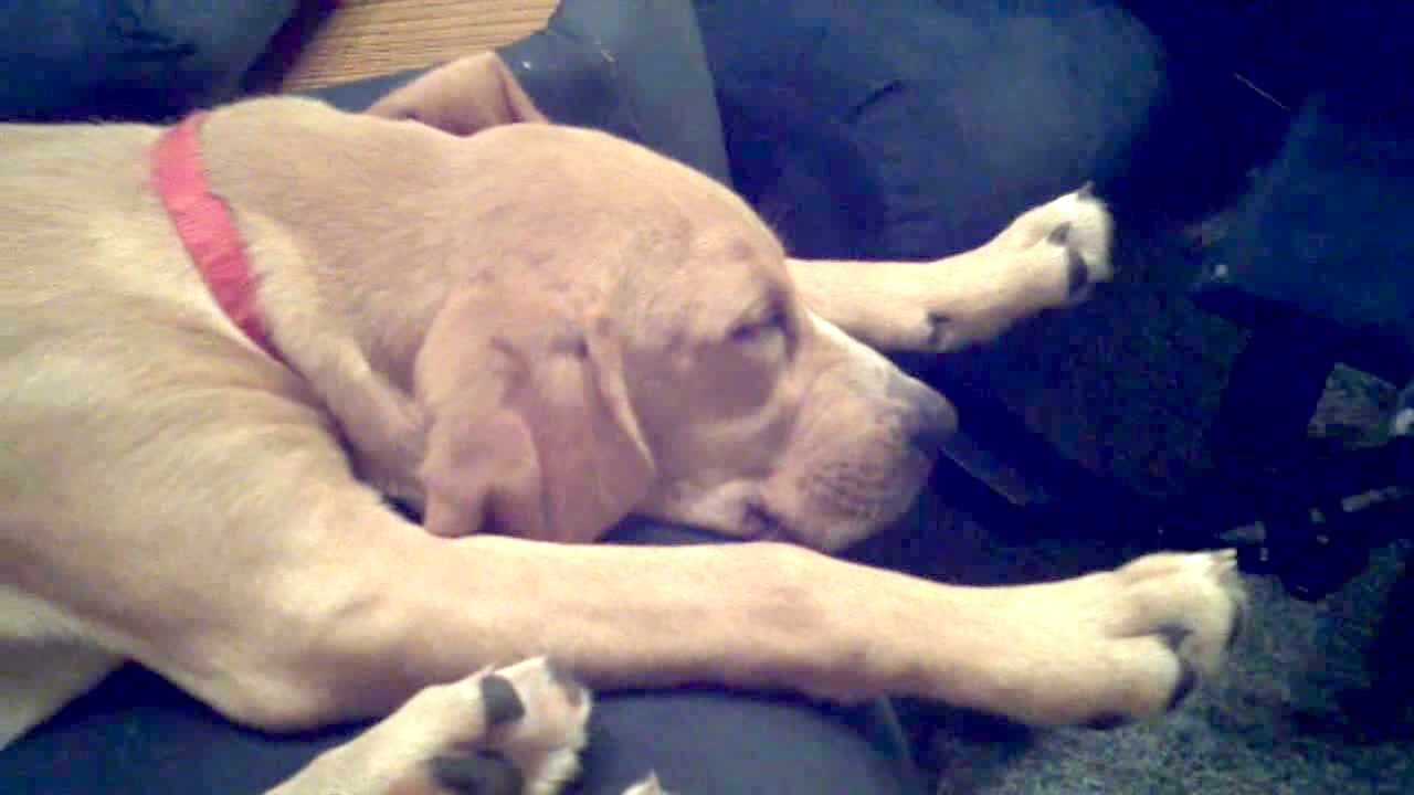 A puppy dog barks in a dream in his sleep and his entire stomach shakes.