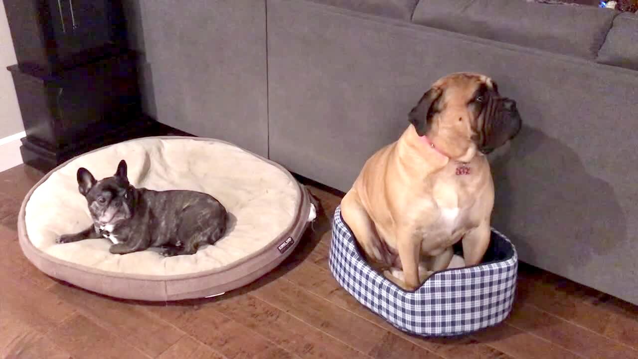 A French Bulldog dog lays in a large dog bed and a Bull Mastiff dog squeezes into and sits in a small dog bed meant for the Bulldog.