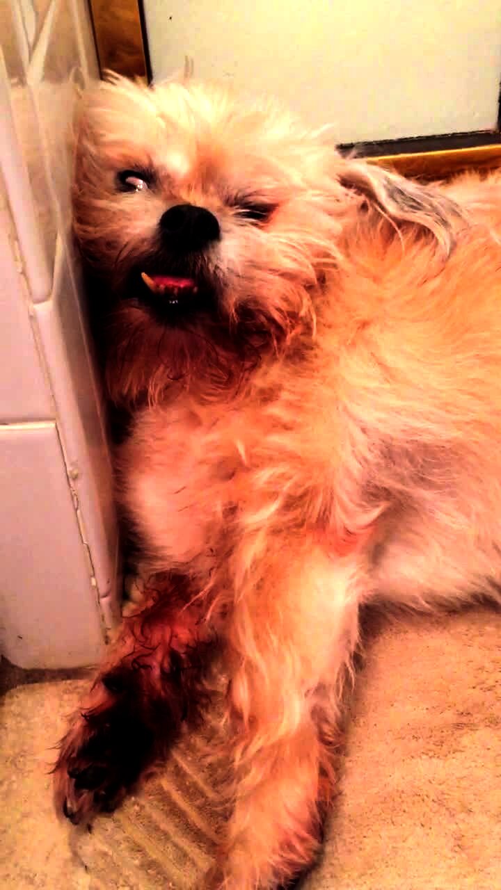 A dog snores up against a wall with its eyes half open and its tongue sticking out. sleep