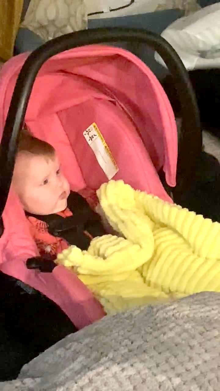A woman attempts to film a baby girl as a dog gets in front of her car seat to try and get all the attention.