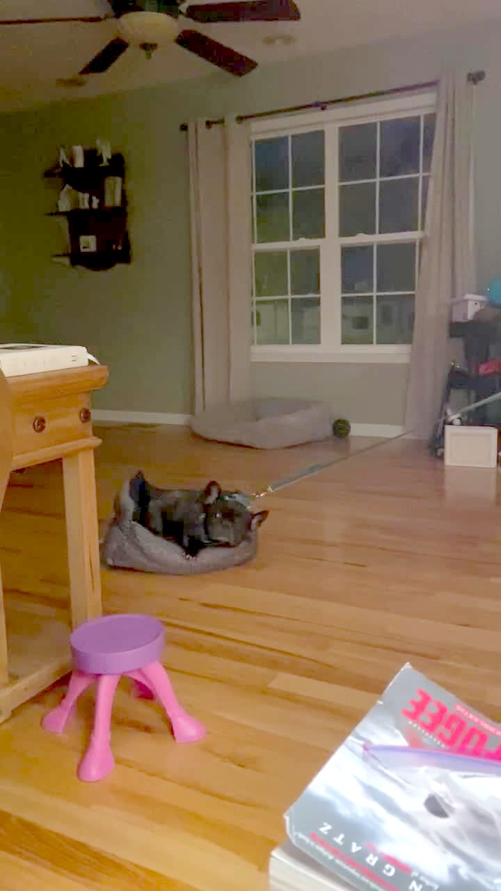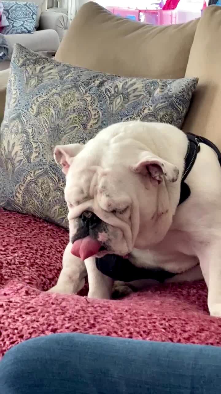 A bulldog dog wakes up in the living room when a man asks if he's hungry.