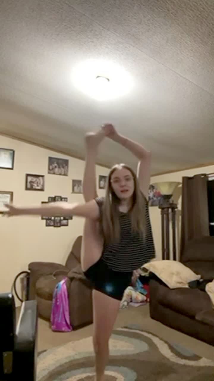A teen girl tries to do a yoga pose but hits her foot on a chair and falls in the living-room. No audio.