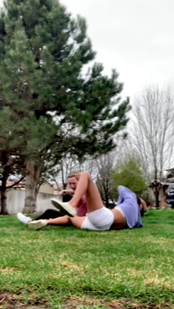 One teenage girls tries to lift another teen onto her back but she loses her balance and they both fall to the ground.
