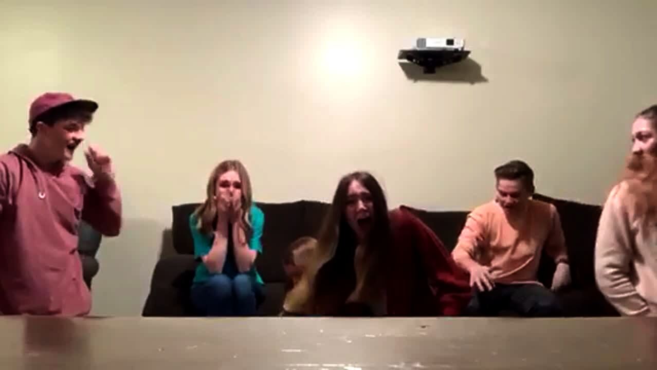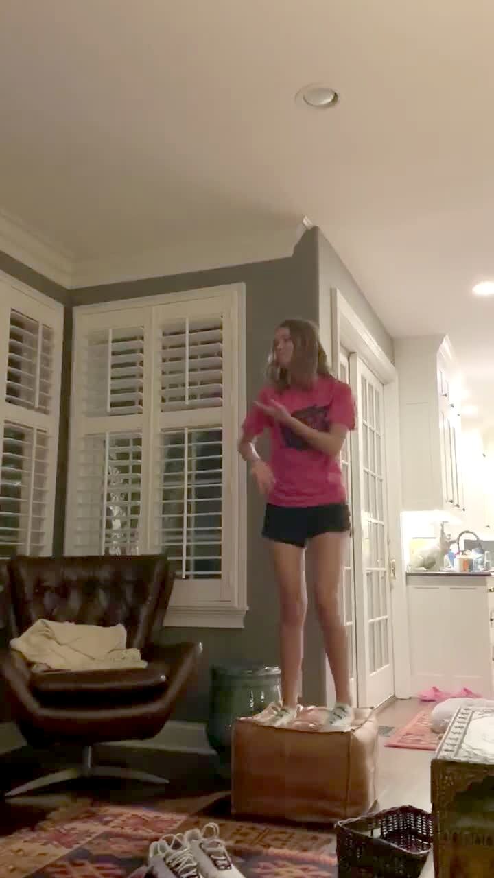A group of teen girls and boys do a pyramid stunt in the living room. When the last girl climbs on top, she hits her head on the ceiling and breaks the light.
