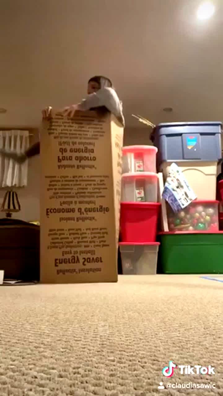 A teen girl climbs into a cardboard box, then it tips over and she falls in a living room.