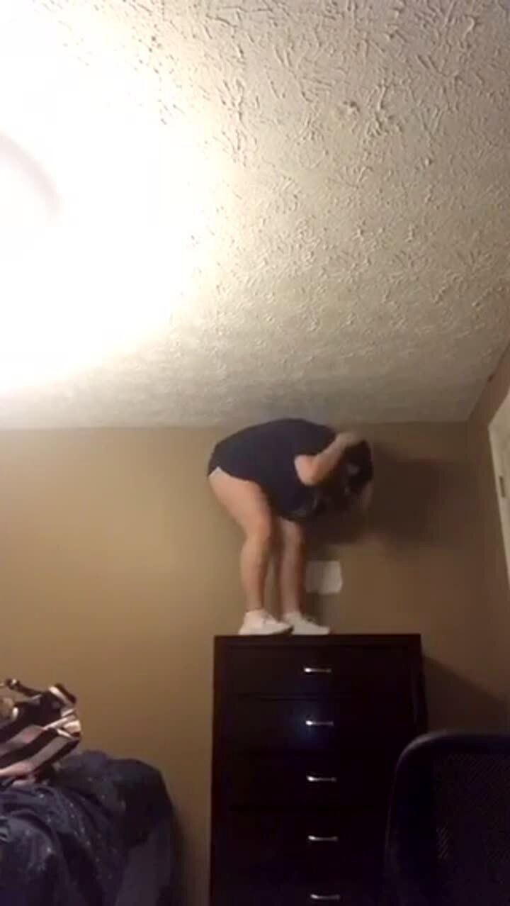 A teen girl climbs on a dresser in a bedroom and falls off and flips and lands on her back and the dresser falls over as well.