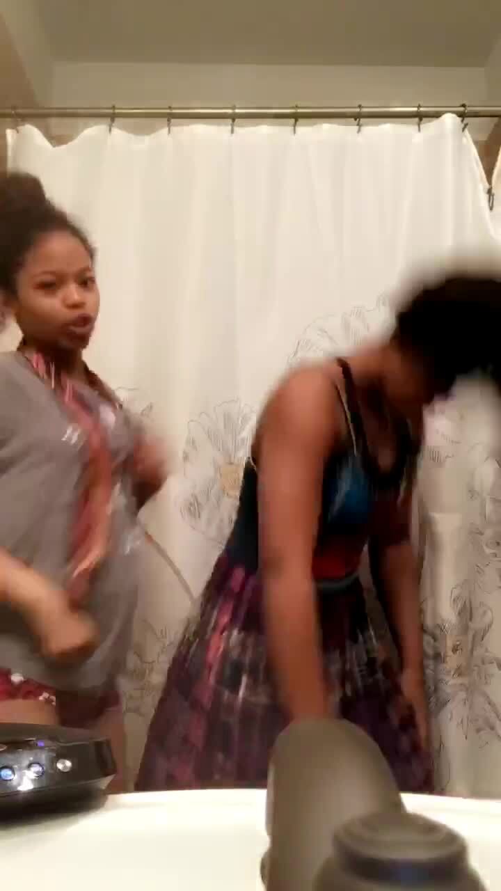 Two teen girls dance in the bathroom, one pushes the other in the head, she falls back and knocks down the shower curtain.