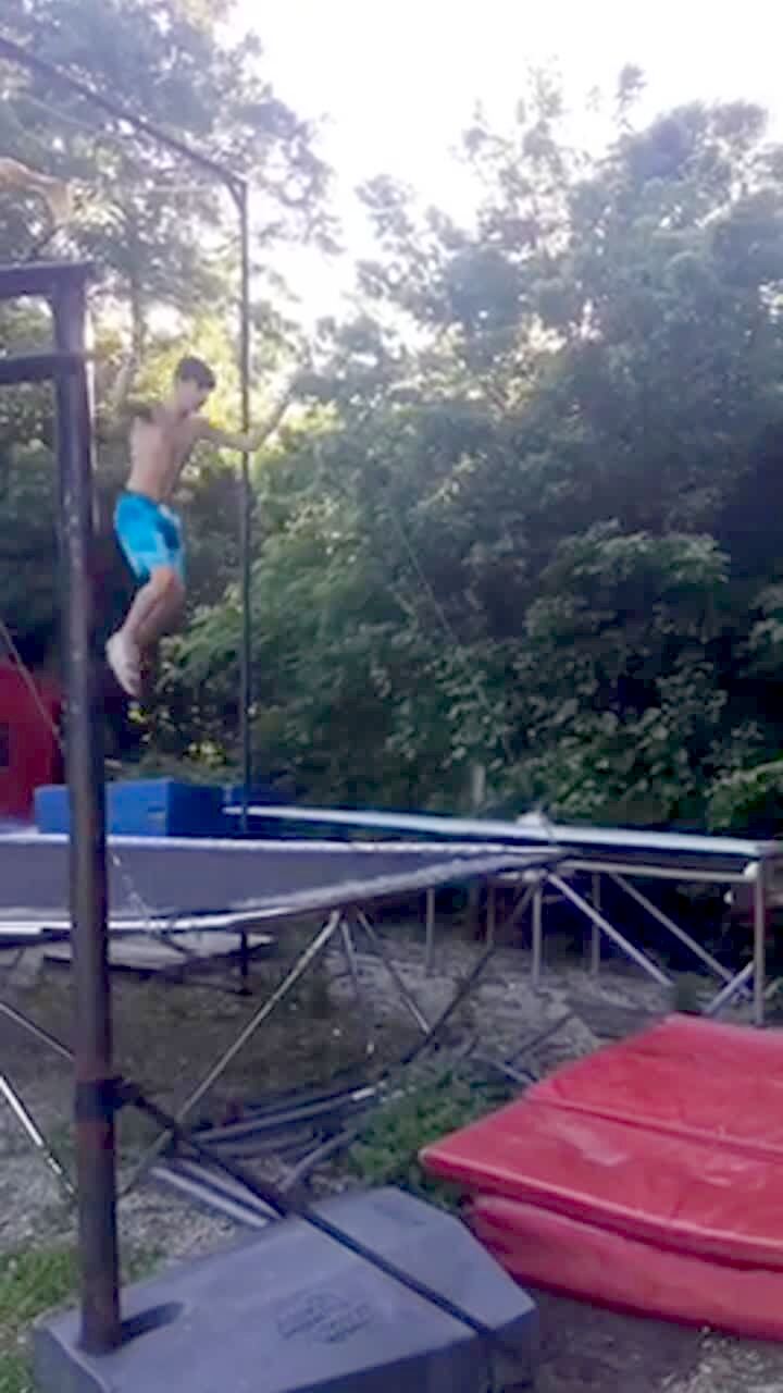 A teen boy attempts to do a flip on a trampoline but falls into the springs and hits his neck and face.