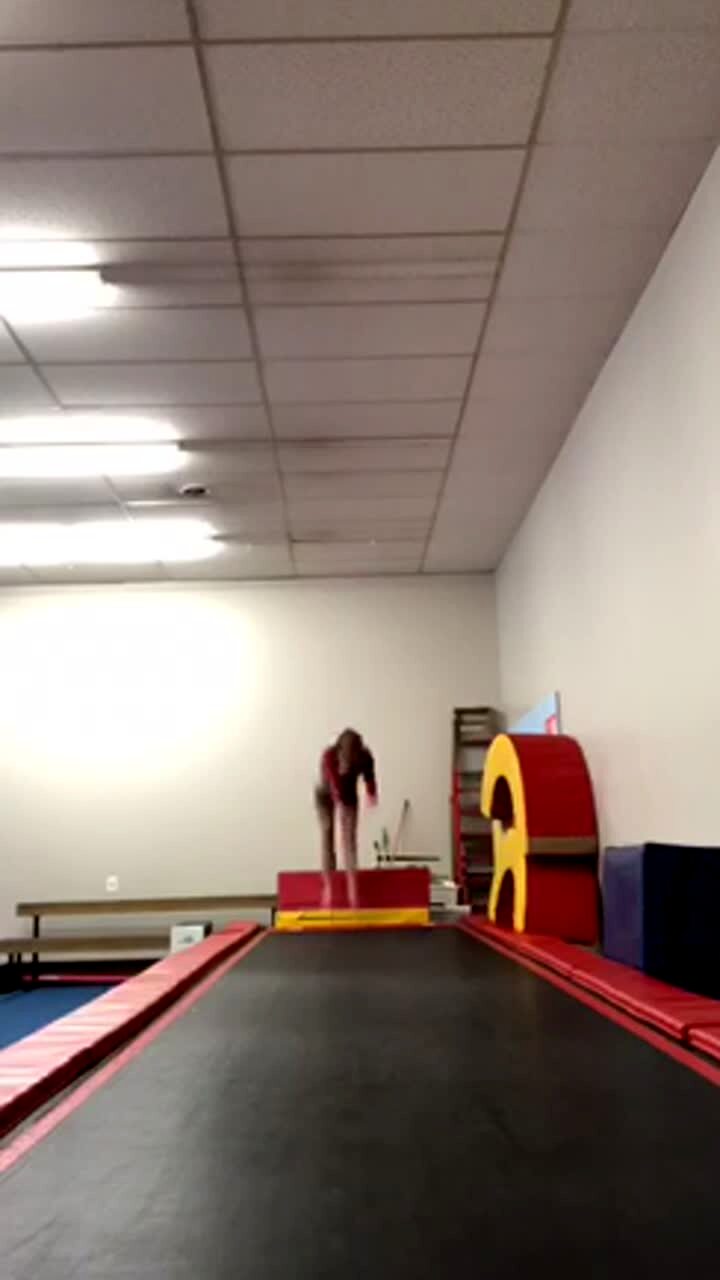 A teen girl does a bunch of flips on a trampoline at an indoor gym. She jumps back and falls off of the trampoline and into the wall.