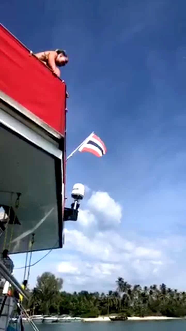A teen girl slips and falls, then flips off of a boat railing into the ocean.