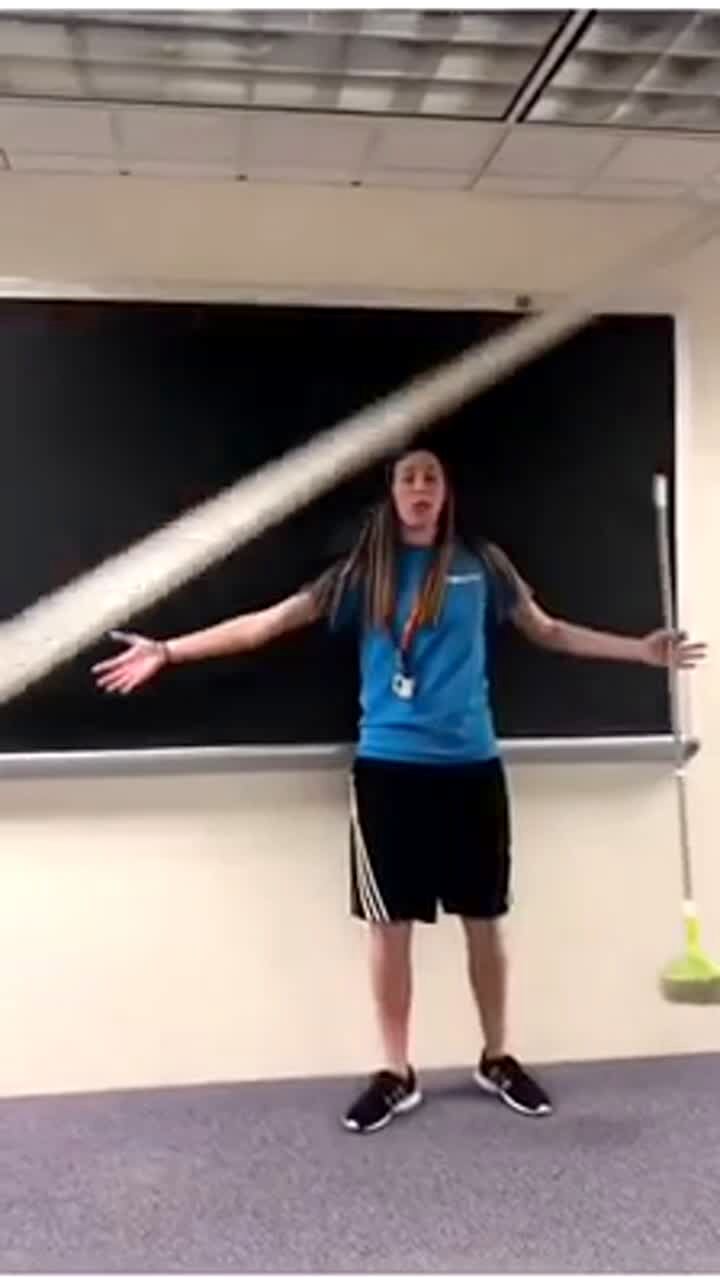 Two teen girls and a teen boy all dance on a pole in the living room and the pole falls over.