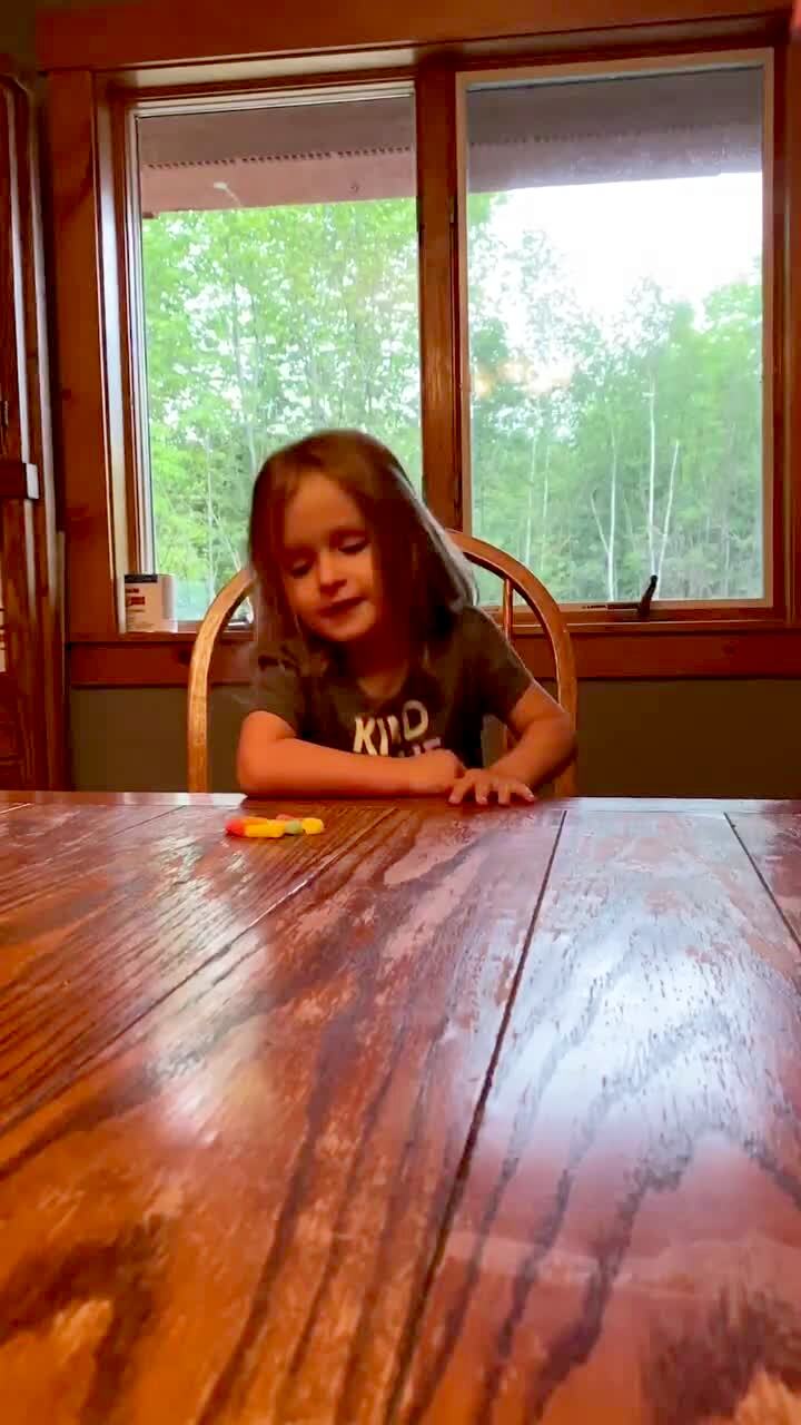 A woman puts candy on the kitchen table in front of a young girl for the temptation challenge and walks away. The girl eats all of them as fast as she can as soon as the woman leaves. She can't keep them all in her mouth and some fall out.