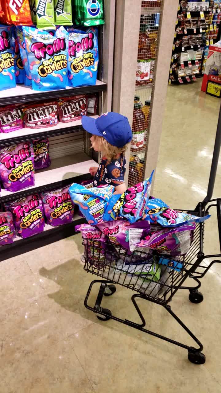 A tot boy stuffs a shopping cart full of candy while he is at the grocery store with his father.