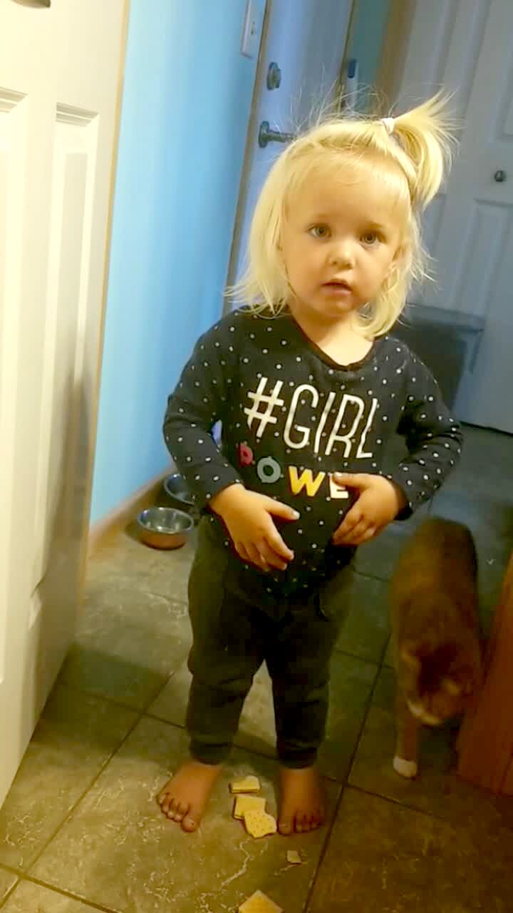 A tot girl smiles in the hallway while cookies fall out of the bottom of her shirt when her mother asks her what's underneath it.