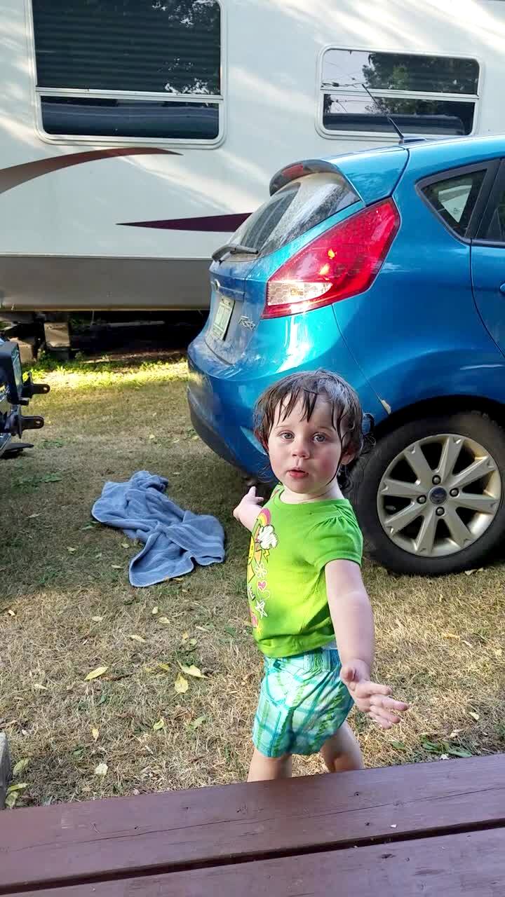 A father tries the "what the fluff" challenge with his tot girl in the front yard. He throws the blanket and hides behind a car. The tot looks around for him, then he pops out from the other side, and the tot laughs.