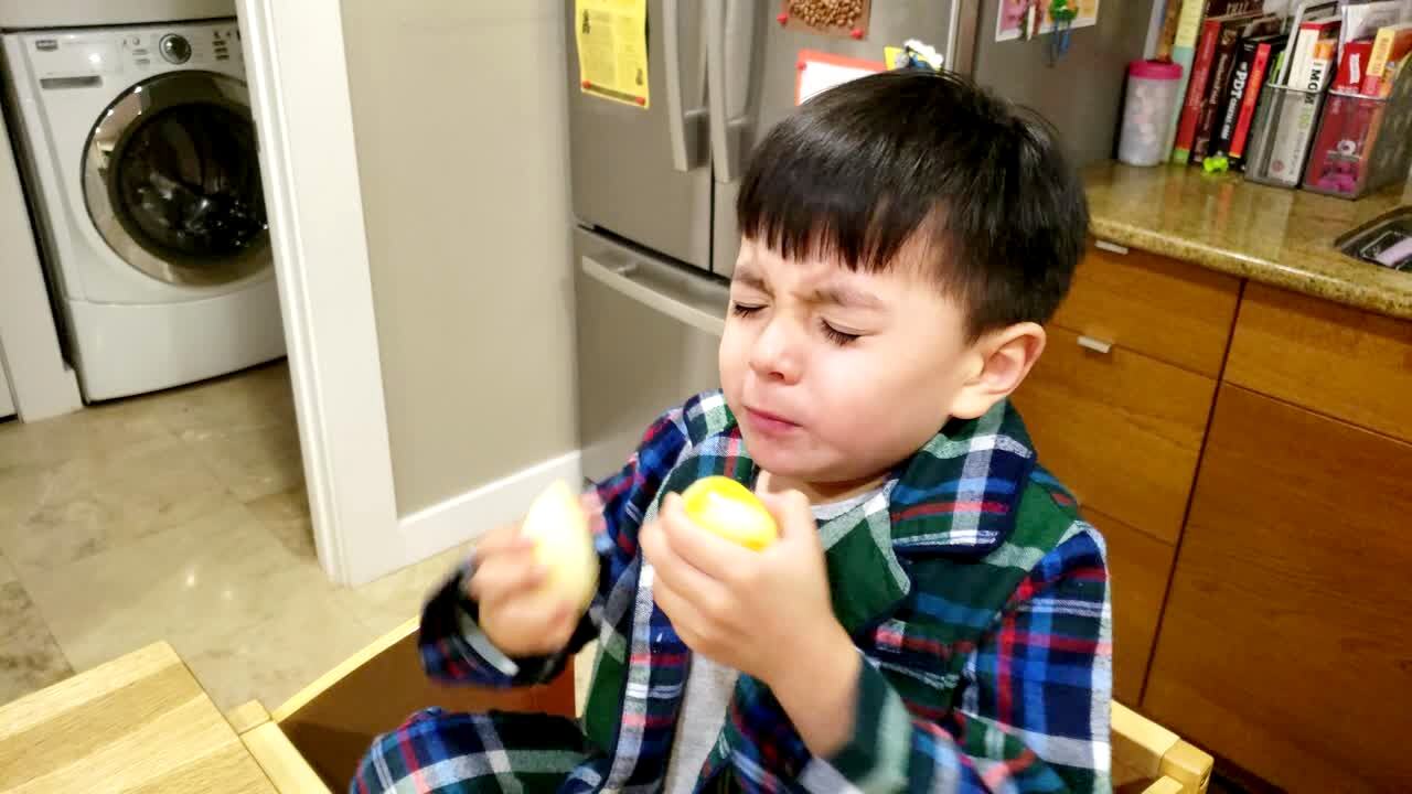 A young boy licks two halves of a lemon and makes a sour face but continues lick the fruit over and over.