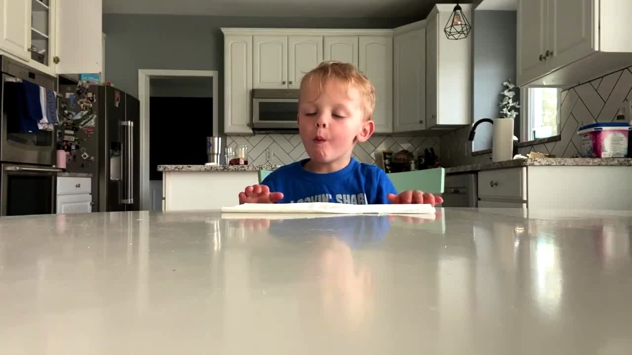A man puts candy in front of a tot boy and tells him not to eat it until he comes back. He immediately puts all the candy in his mouth at once, eats it, then walks out of the kitchen.