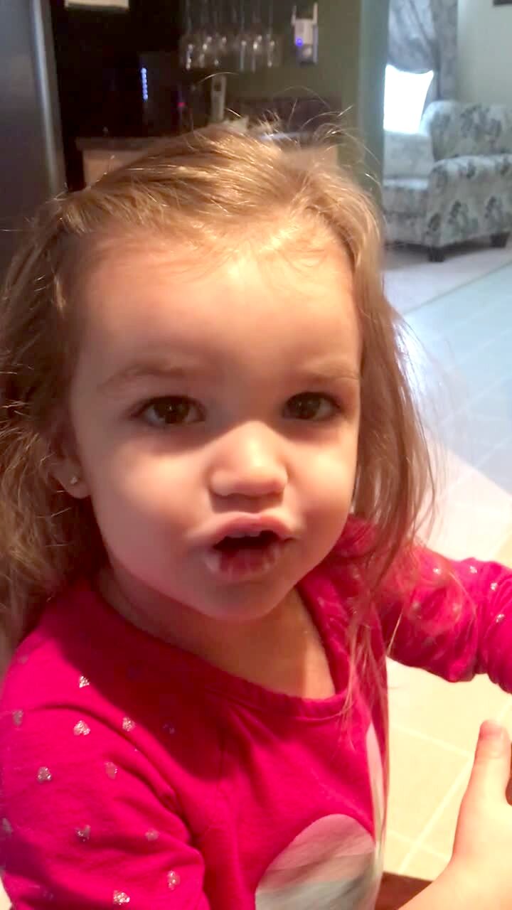 A man teaches his tot girl how to say "yogurt," but she repeatedly pronounces it as "work it."