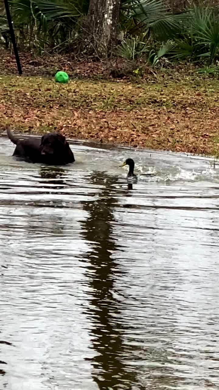 A chocolate labrador retriever dog plays with a duck bird in a pond, and the duck rides on the dog's back.
