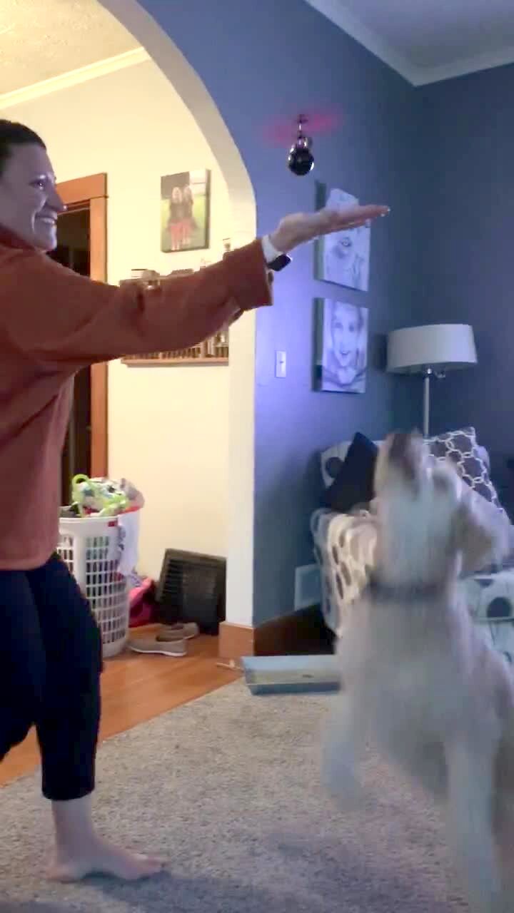 A Goldendoodle dog jumps up and catches a drone that a woman flies in the living room.