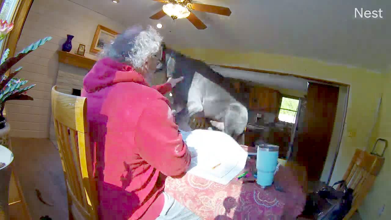 A man sits at a dining table and a Great Dane dog jumps onto the table and knocks wine glasses over and they break on the floor. Security camera.