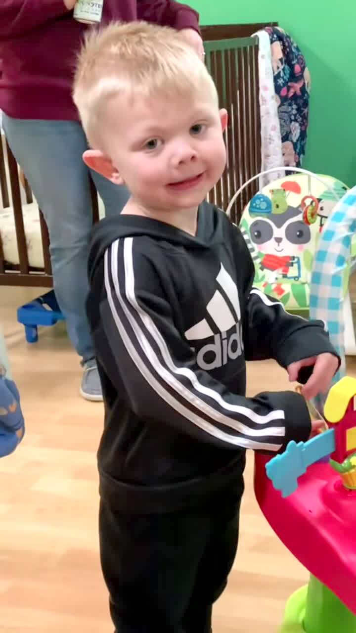 A tot boy in a living room holds a stack of foam letters in his hands. His mom asks "are you ready to mail your letter to Santa?" and he nods his head. She explains to the camera that he thought he meant his alphabet mat letters, not his envelope.