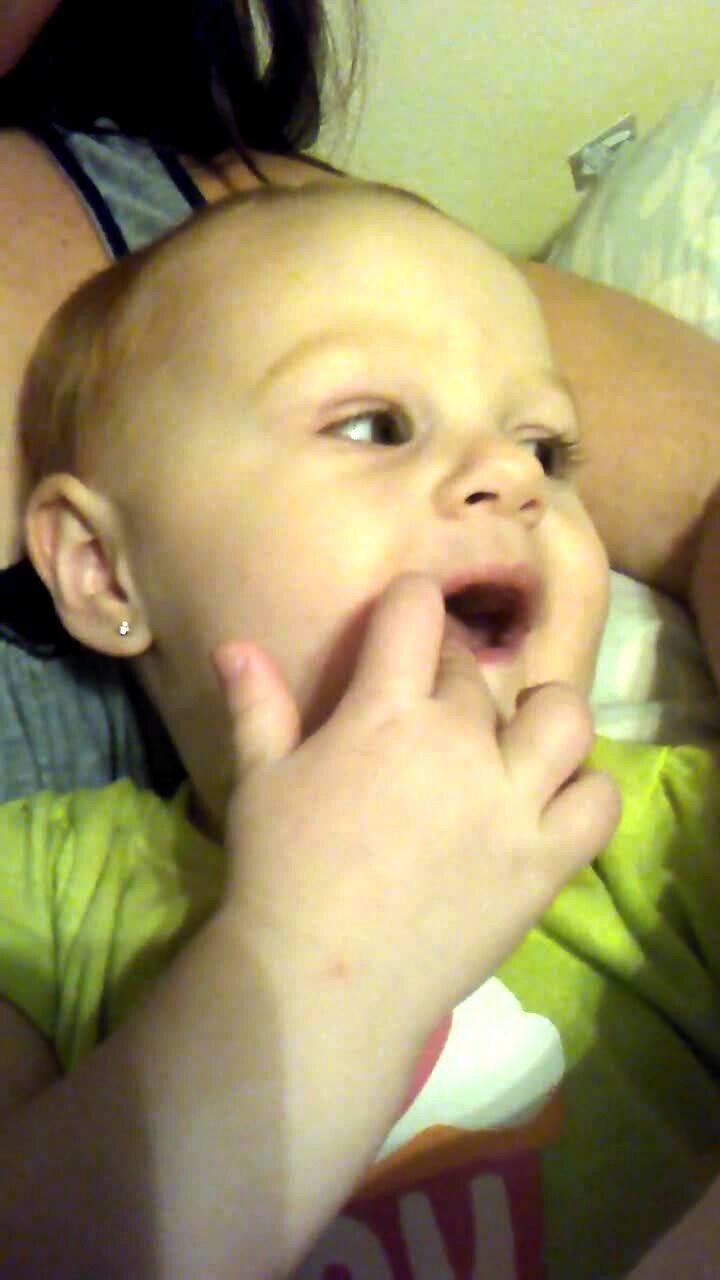 A baby girl shows her mom her "mad face" indoors. Vine/Instagram video.