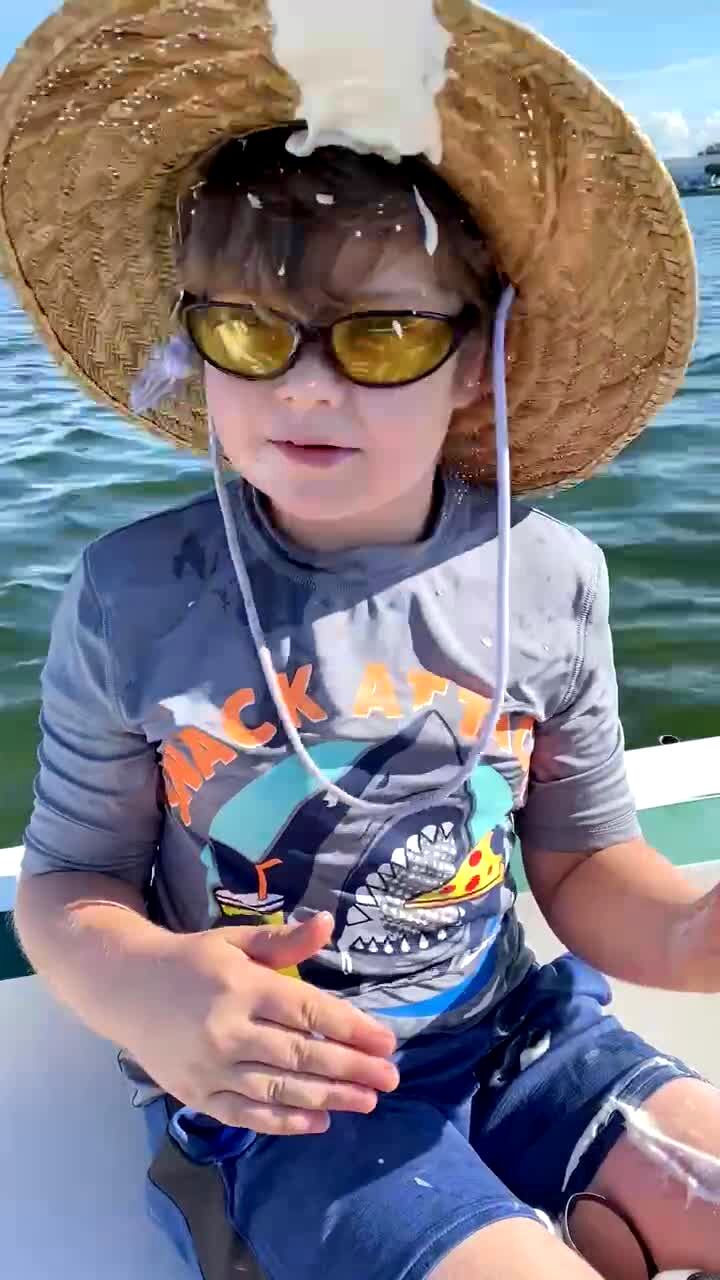 A young boy flings sunscreen and it sticks in the boy's hat and hair while mom and dad talk to him on the water.