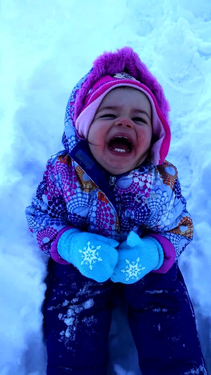 A tot girl sitting in the snow says "boys" repeatedly and laughs hysterically as she talks to her dad in the winter snow outdoors.