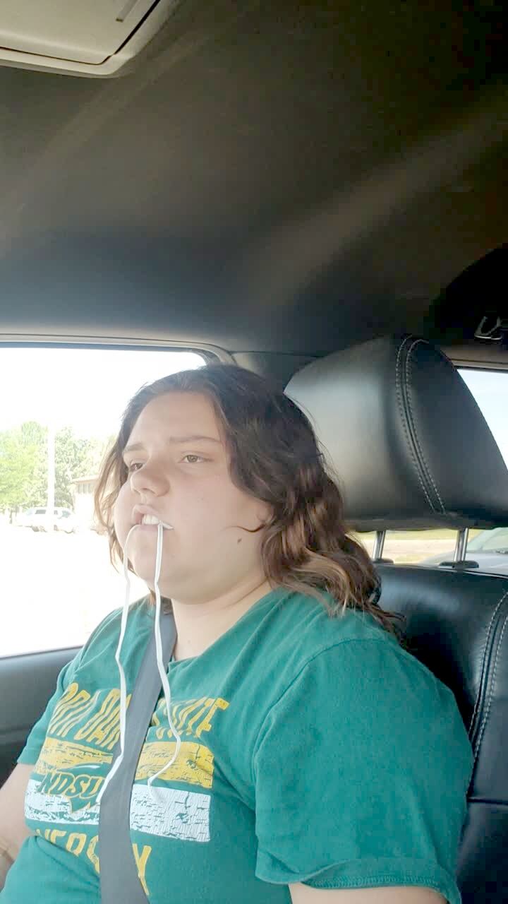 A teen girl in a car tells a woman that the dentist took her tongue, lips, and throat instead of her wisdom teeth, then she says "I thought I was going to get a boob job." Her mom says she doesn't need a boob job and she says "They're saggy like grandma's."