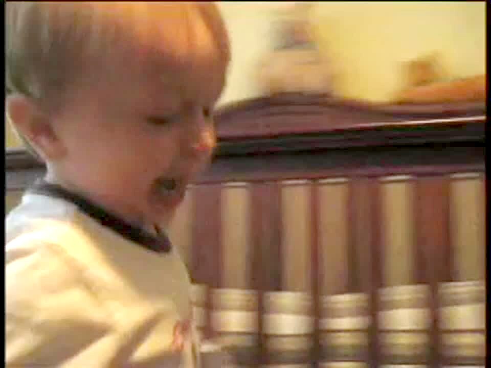 Remote control toy car pushes young boy's chair off a driveway and onto the grass. Boy falls out and then the RC car rolls on top of him.