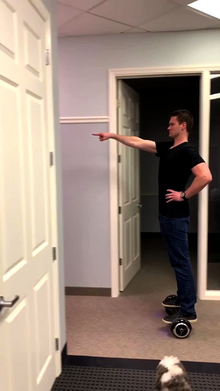 A dad rides a hover board down a hallway in a house and his baby girl runs in a bouncer walker chair behind him.
