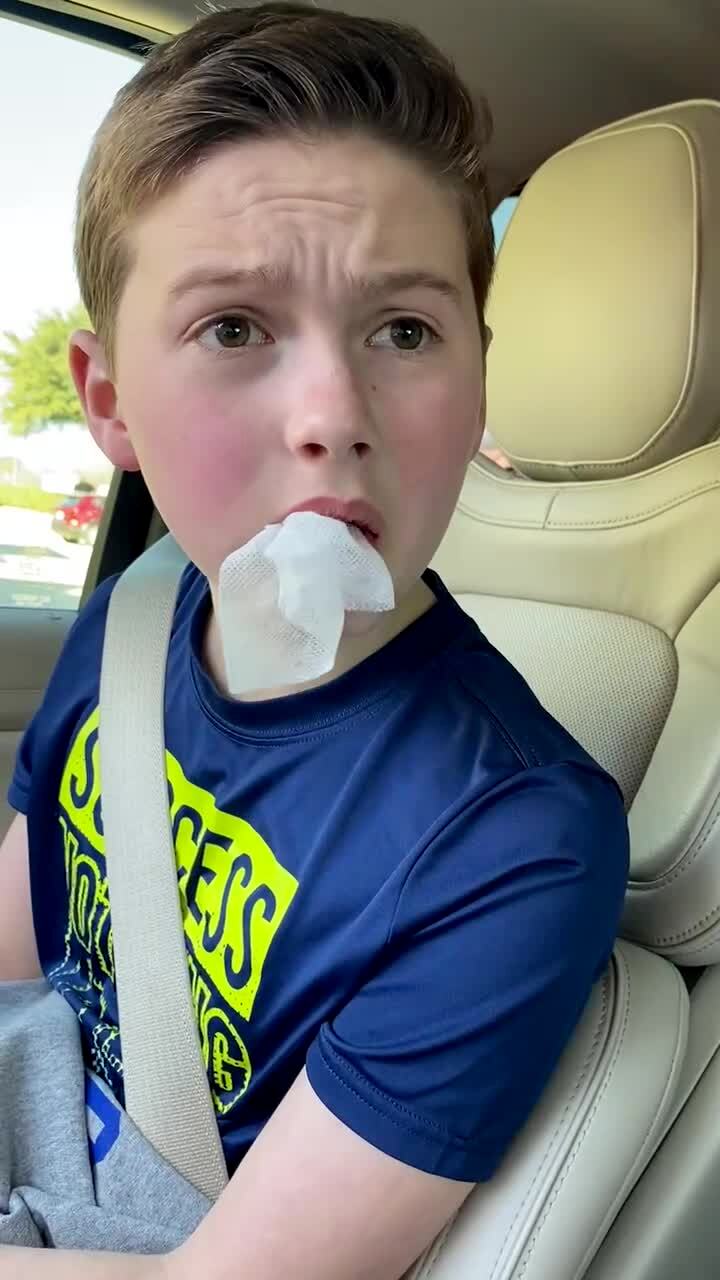A woman in a car records a selfie over her shoulder and a dog sits in the back of a car and another dog is stuck between the back seat and the trunk and hangs over the seat with their butt towards the camera.