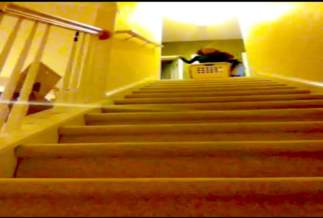 A girl pushes a boy down indoors stairs in a laundry basket. He falls out and hits the camera.