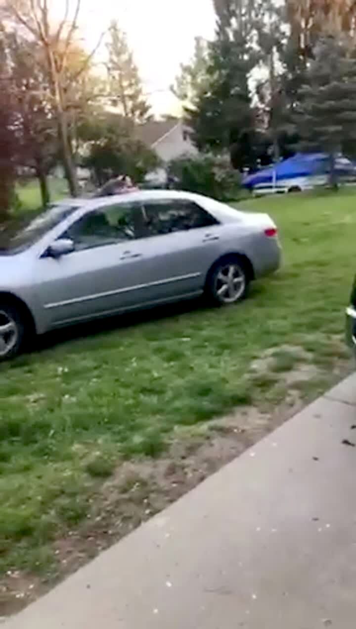 Black lab puppy barks at remote controlled car young girl is playing with. Dog sits on tot boy's head.
