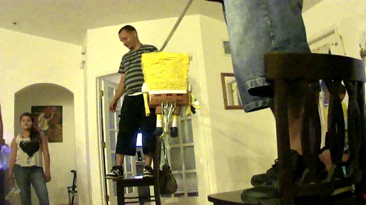 A man gets hit in the groin while he holds up a pinata at a party indoors.