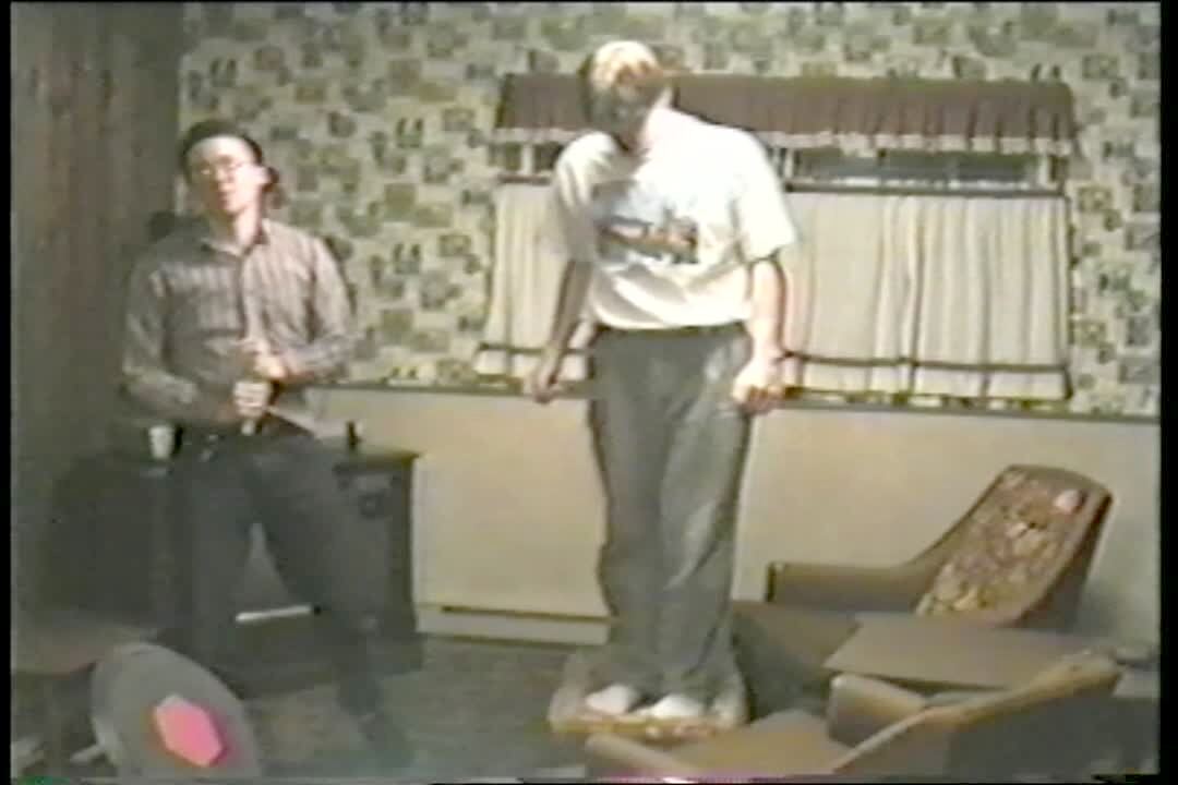 Two men try to recreate the Dirty Dancing move - as one jumps into the other's arms. They fall over and one lands on top of the other's head in the kitchen.