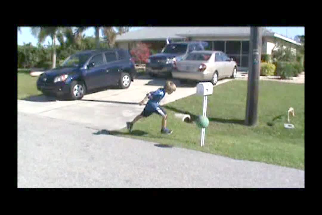 A teen boy smashes his face into his birthday cake. It's frozen and doesn't smash and he hurts his nose. Practical jokes.