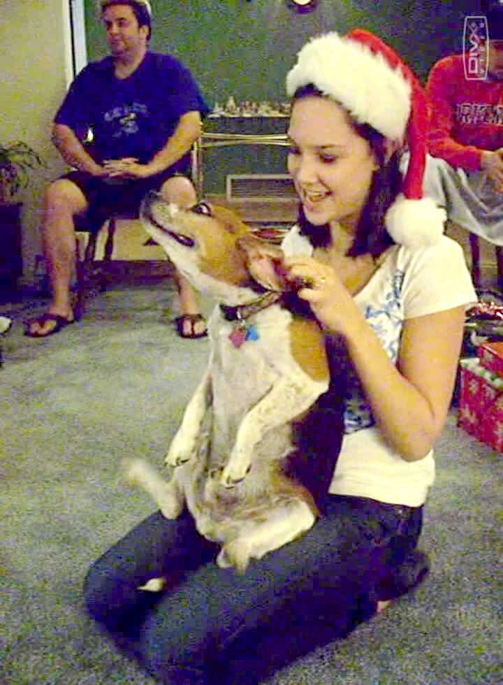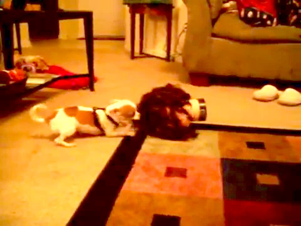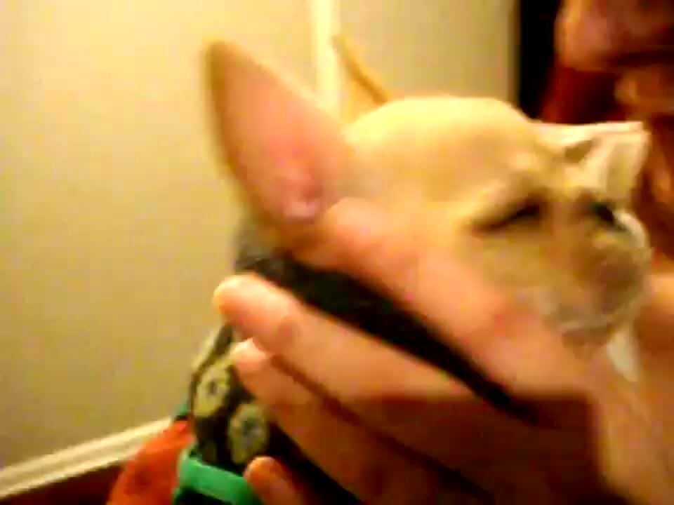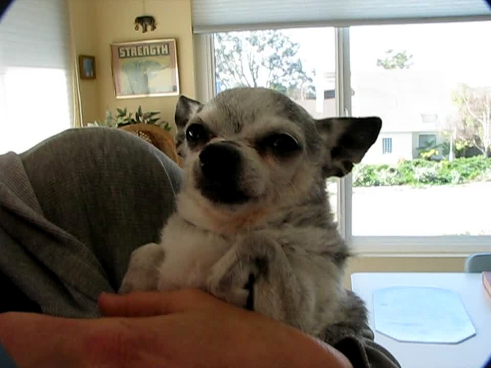 Man holds Chihuahua & woman behind camera says the dog has such a cute face. Then a hand comes from the right side & dog growls & bites at it. Short tail.