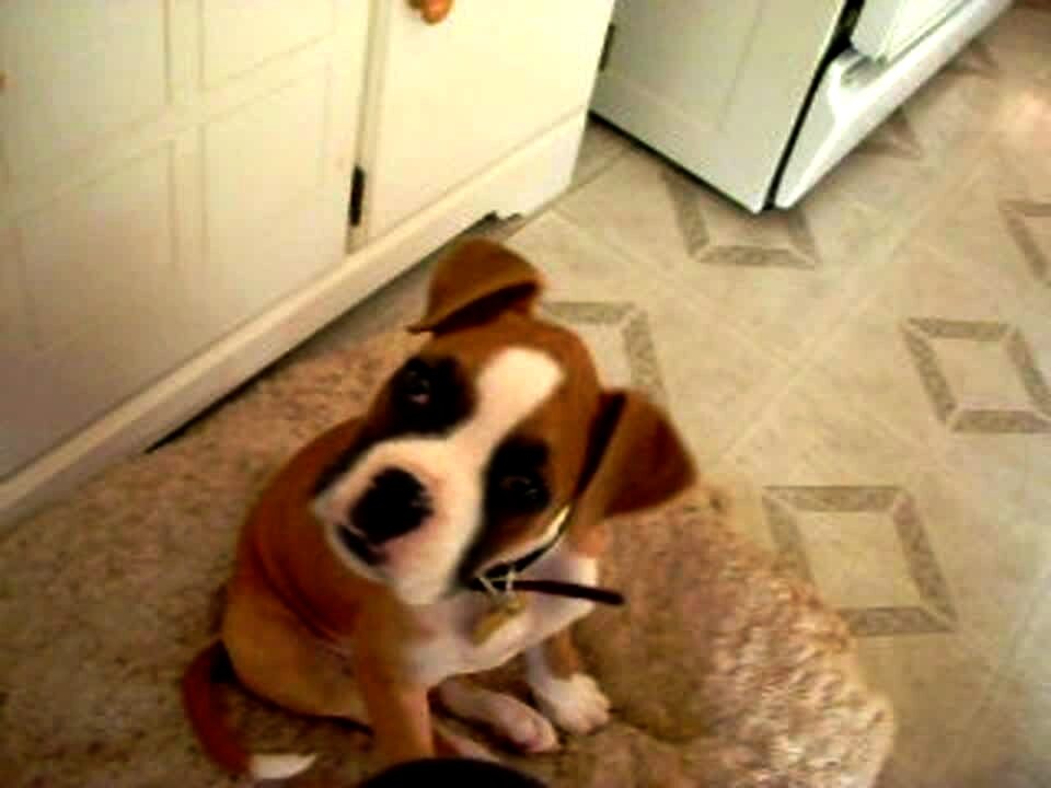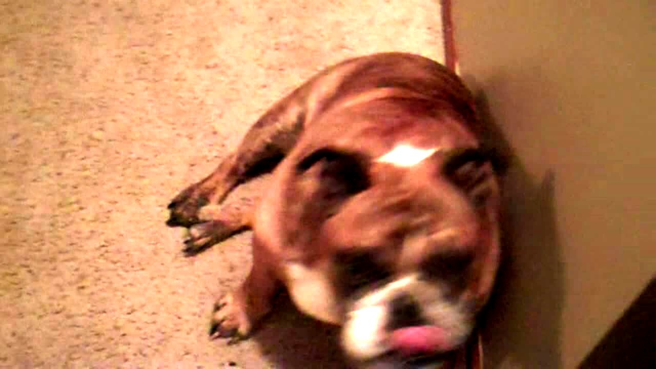 French bulldog makes cute noises when woman makes odd sounds to the dog. Woman then says "I love you" and it sounds like dog repeats it back to her. Talking dogs.