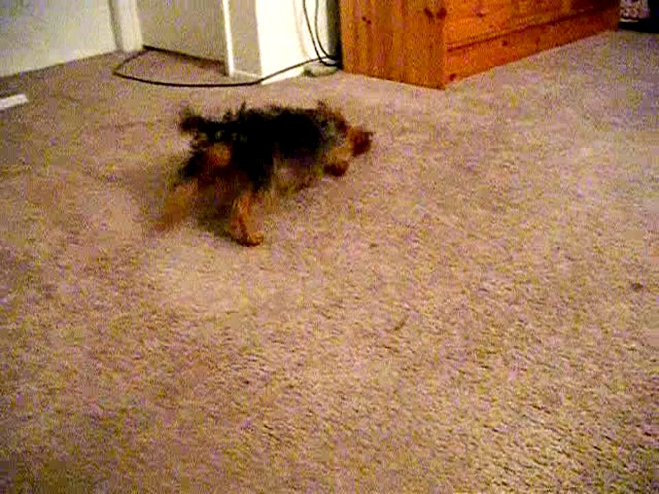 Yorkie dog dries herself on the rug after a bath by rolling around. Long for edit.