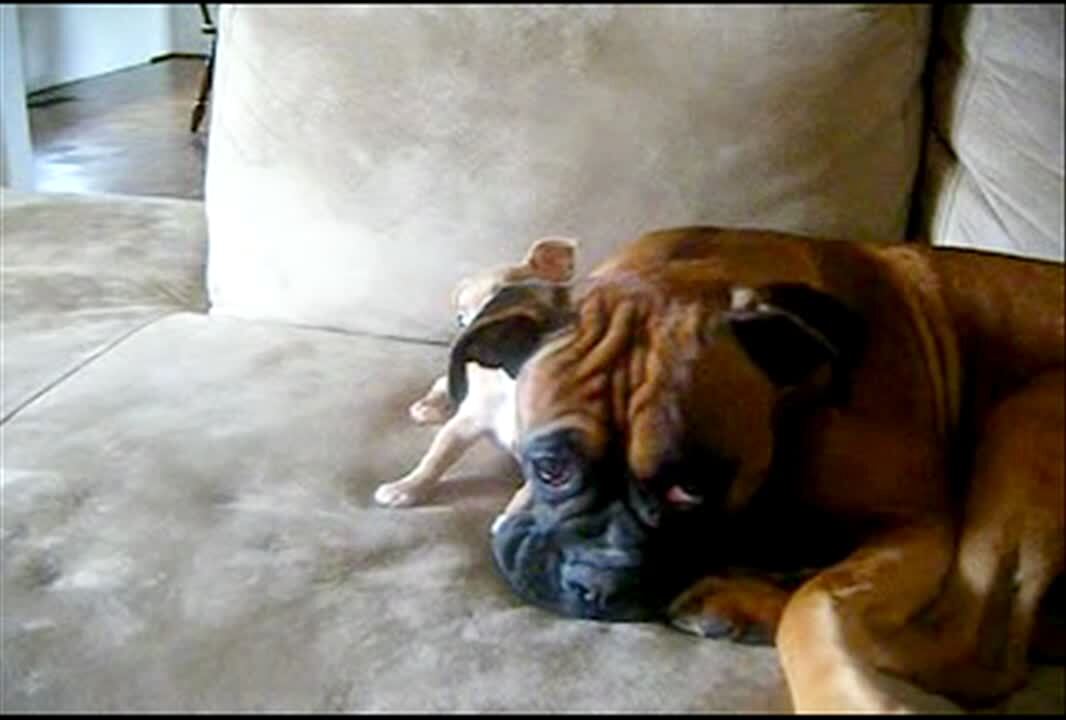 Boxer dog lets a Chihuahua puppy bite its ears on the couch. Long for edit. Looks like puppy is eating him.