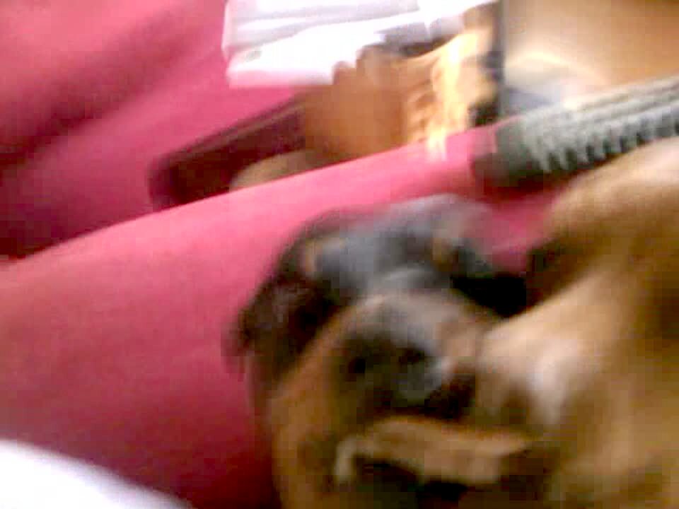 2 pugs tilt their heads when man whistles off-camera. Shot from above the dog's heads. Long for edit.
