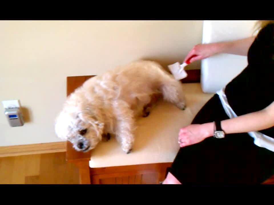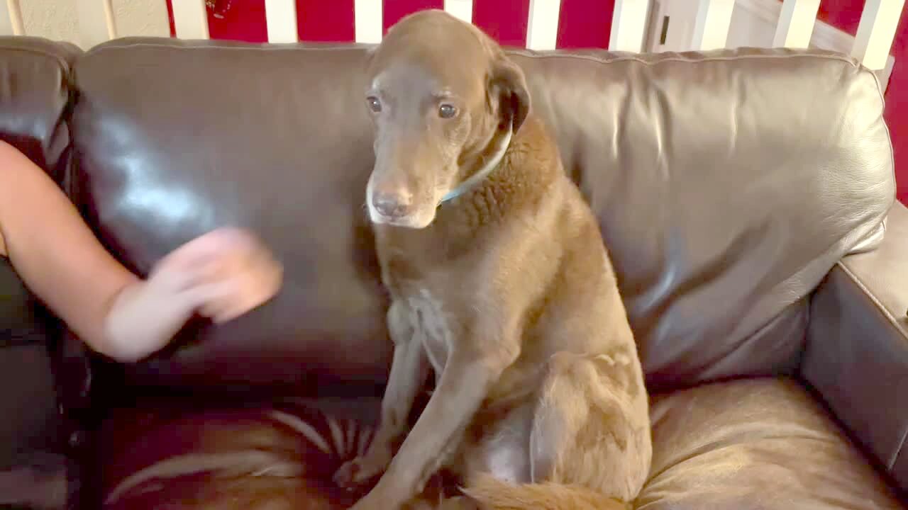 Shaggy brown dog kicks leg as woman brushes its side on couch. UGC-EP experienced an error.