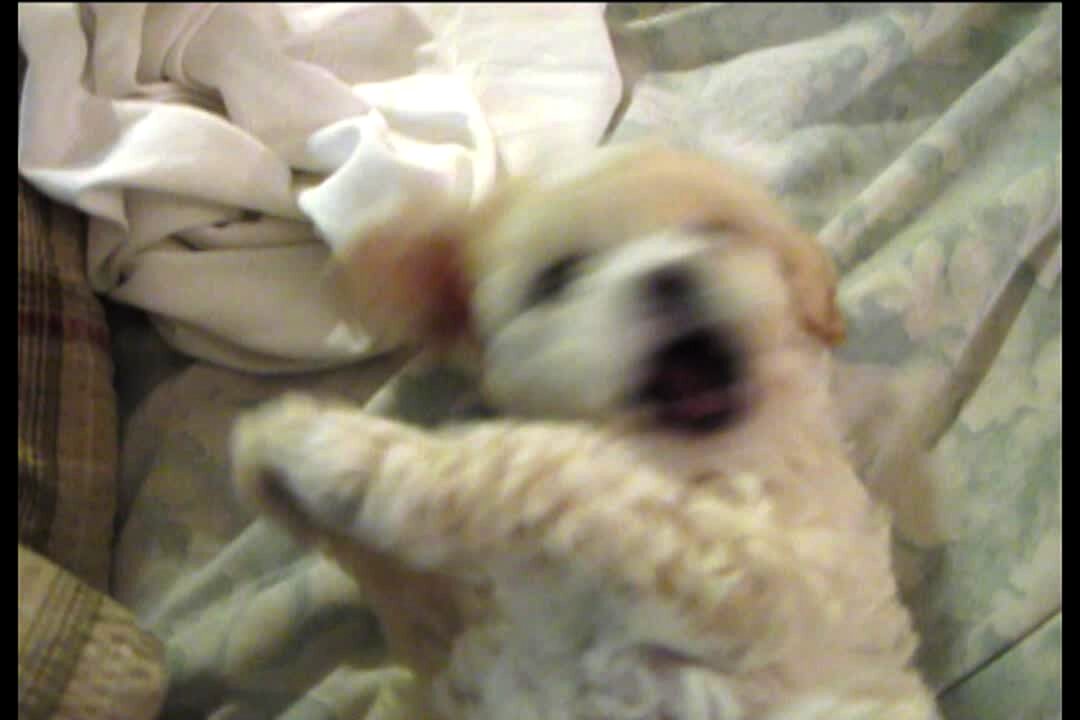 Little white fluffy dog lays on its bed putting its paws together on command whenever woman tells it to "pray."