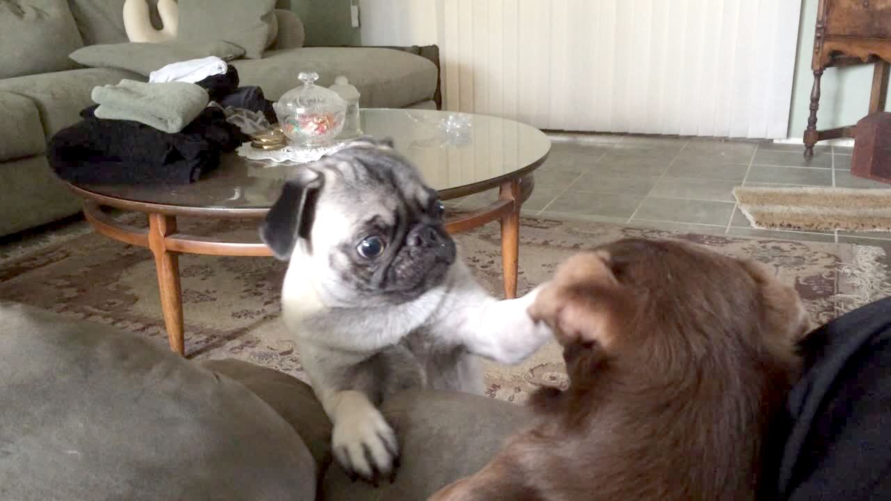 A Pug dog paws at another dog on the living room couch and won't stop even when the other dog snaps.
