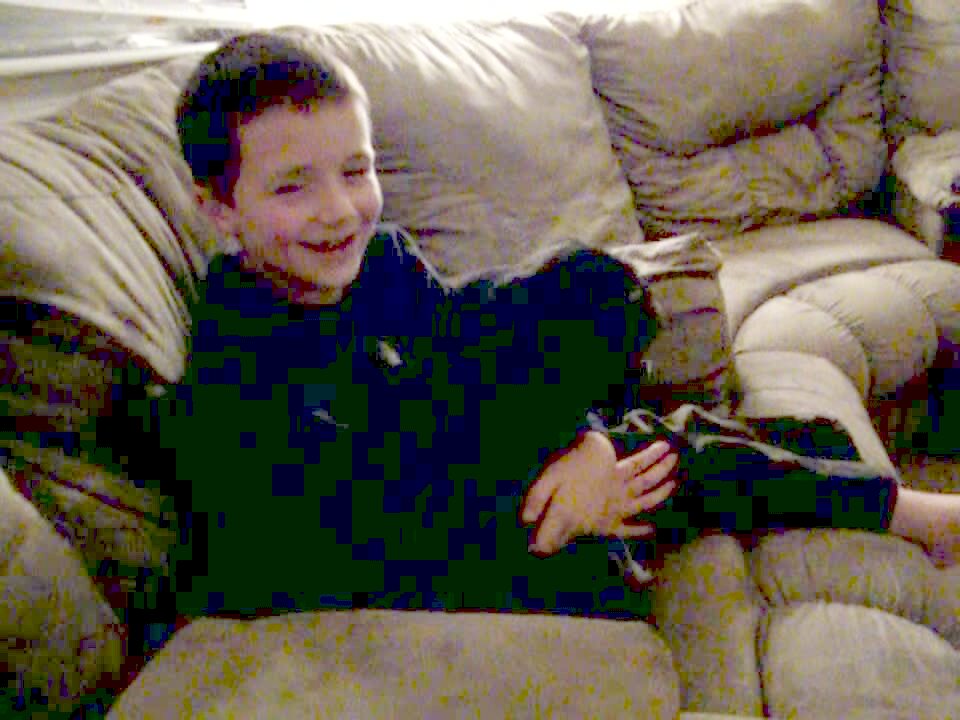 Young boy holds a black pug dog in his lap & counts to 10 while man hides. Boy lets the pug go & dog tries to find man, running around the house barking. Hide and seek.