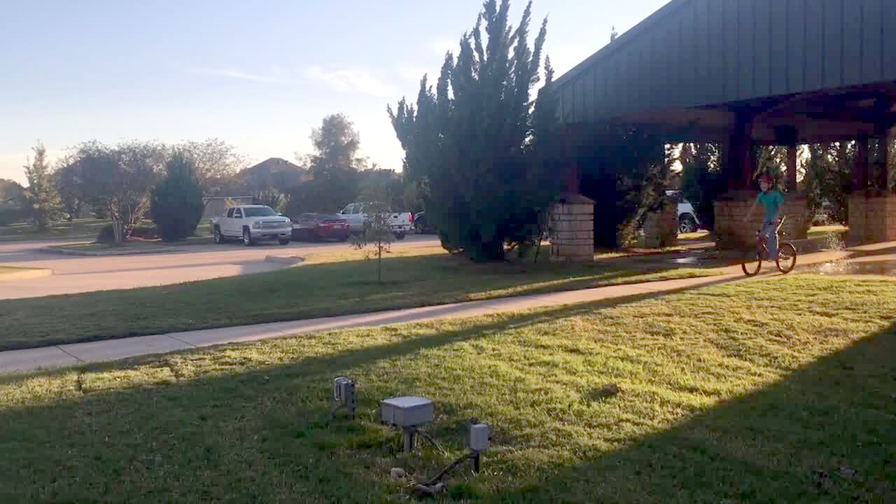 A man parks a car in a parking lot and gets out and gets chases by a goose bird and gets knocked to the ground. Security camera.
